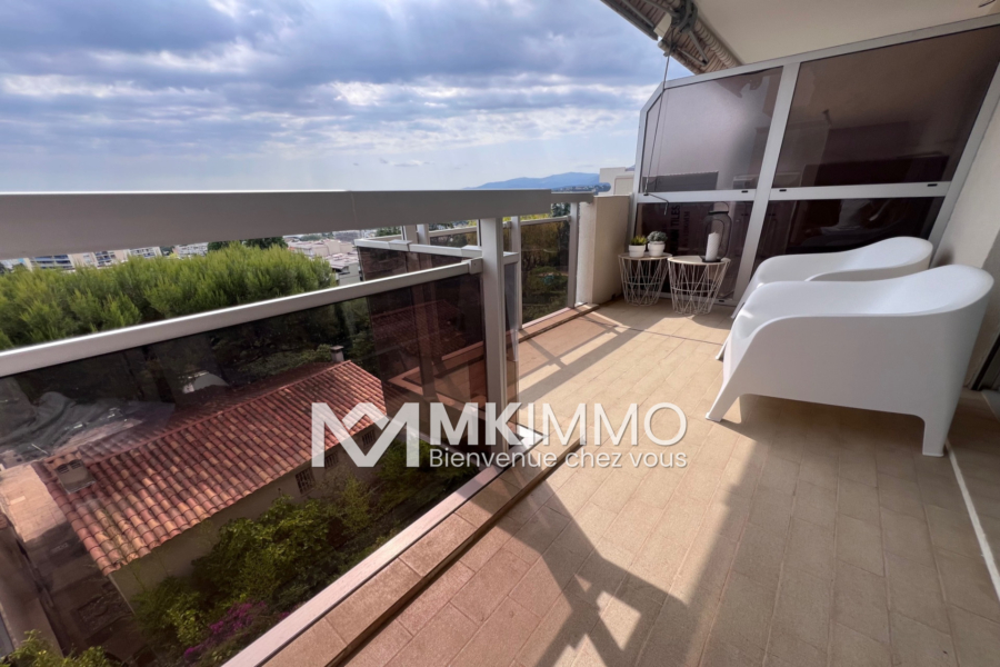 Jolie 2 pièces de 52 m² refait à neuf il se compose d’une entrée, un grand séjour donnant sur une terrasse de 14 m² avec vue mer panoramique, une chambre, une cuisine indépendante donnant sur une 2e terrasse, une salle de douche et un toilette indépendant.