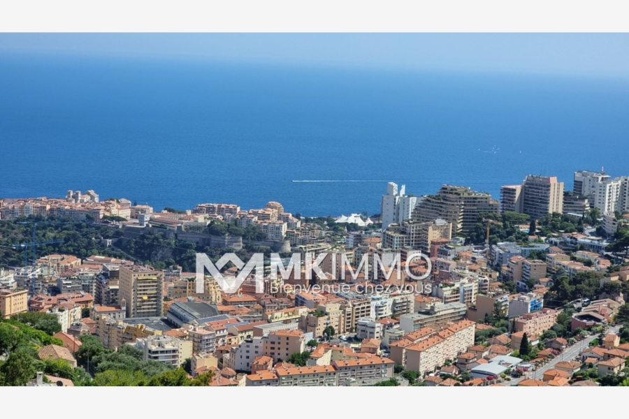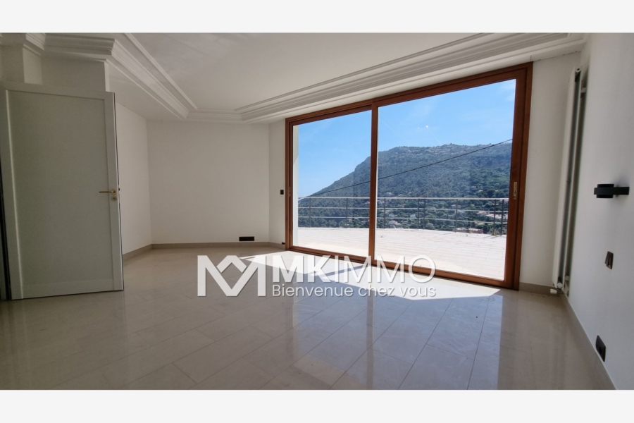 Au 1e étages 160 m² de séjour, cuisine équipée et aménagée donnant sur une grande terrasse avec vue mer surplombant le rocher de Monaco.